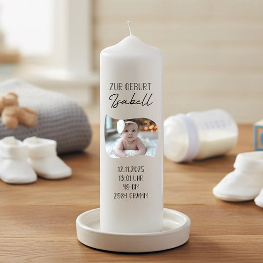 Kerze zur Geburt mit Deinem Foto und Geburtsdaten bedruckt