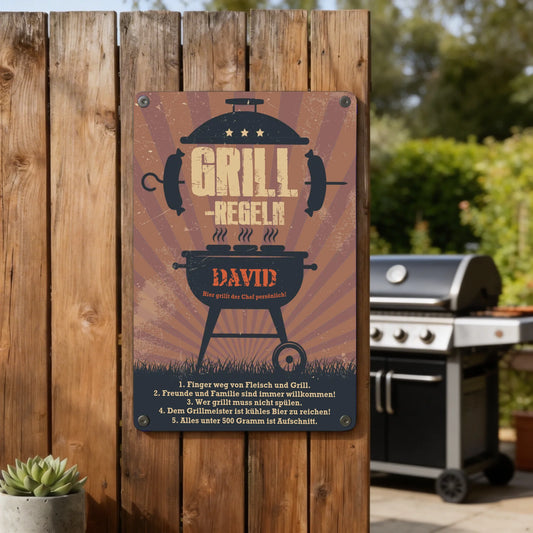 Bedrucktes Blechschild Grill-Regeln mit Wunschtext