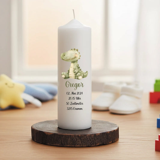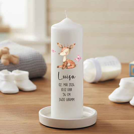 Kerze zur Geburt mit Tier und Geburtsdaten bedruckt
