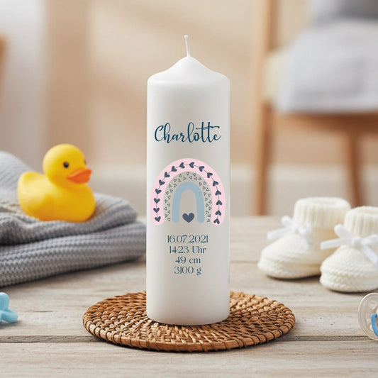 Kerze zur Geburt mit Regenbogen individuell mit Name bedruckt