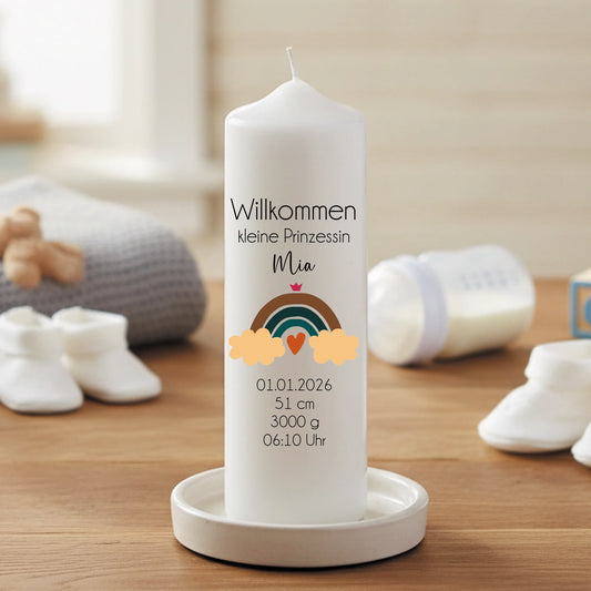 Geburtskerze mit Regenbogen individuell mit Name bedruckt