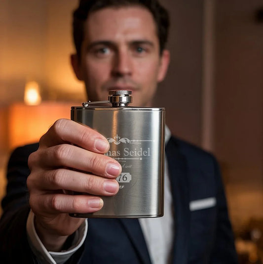 Wir haben tolle Flachmänner mit individueller Gravur. Du gestaltest und wir gravieren diesen individuellen Flachmann. Dieser besteht aus rostfreiem Edelstahl und ist dank seiner kompakten Form der perfekte Begleiter für unterwegs - ob im Winter oder Sommer.