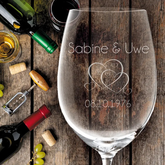 Als Geschenk für eine Hochzeit sind gravierte Weingläser mit Ringen oder mit Herzen äußerst beliebt. Die exklusiven Weingläser werden durch die Gravur des Namens des Brautpaars und der Hochzeitsdaten individualisiert. Eine edle Holzkiste, die ebenfalls personalisiert wird, rundet das gelungene Geschenk zur Hochzeit ab.