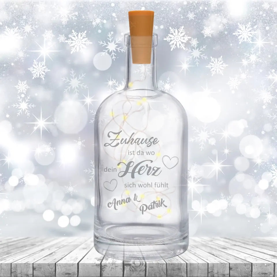 Individuell gravierte LED Flasche "Zuhause ist da wo dein Herz sich wohl fühlt"